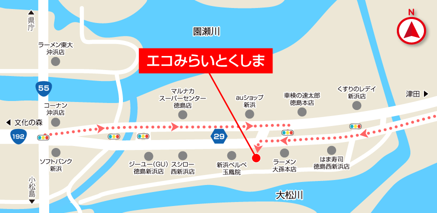 西側(国道55号)からお越しの際は県道29号でUターンが必要です。
