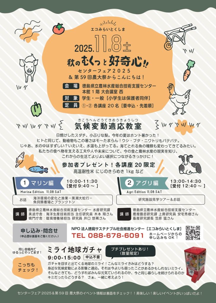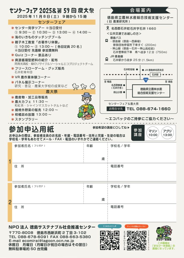 今年も徳島県立農林水産総合技術支援センターにおじゃまします! 当日は、センター&農大祭です。こちらもお楽しみください!(チラシ裏面をみてね!)