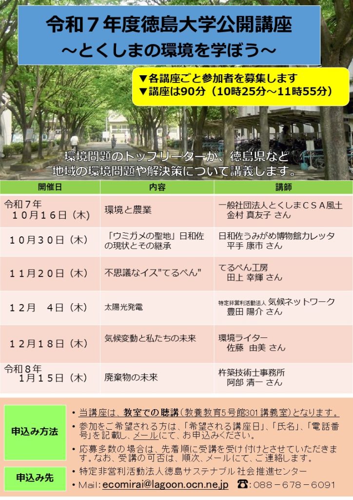 2025年10月3日 / 最終更新日時 : 2025年10月3日 webmaster 【募集中】徳島大学公開講座 ~とくしまの環境を学ぼう~ 申し込み 「【募集中】徳島大学公開講座 ~とくしまの環境を学ぼう~」の参加申し込み