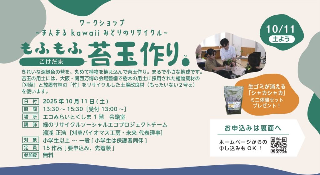 2025年9月24日 / 最終更新日時 : 2025年10月12日 webmaster 講座 【満員】ワークショップ:もふもふ苔玉作り♪ 申し込み 「【満員】ワークショップ:もふもふ苔玉作り♪」の参加申し込み 講座講座